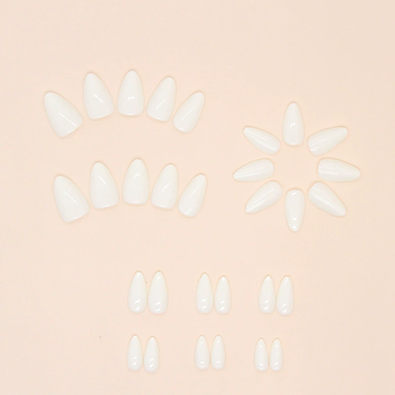 Short Almond Kit includes : Cuticle stick Double-sided nail file 30 nails (15 inclusive sizes, 30 pieces Nail glue (2 mL / 0.07 fl. oz.) Alcohol Pad